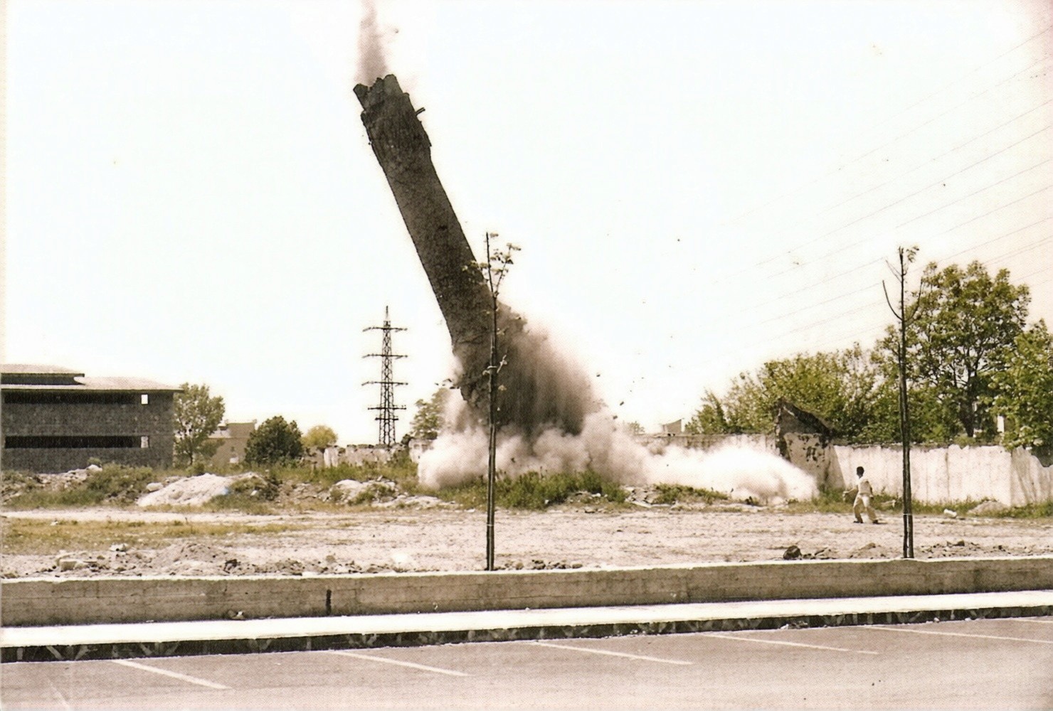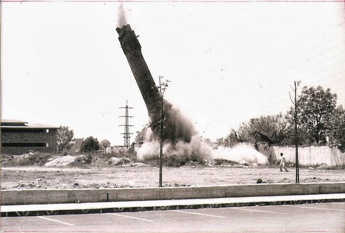 Questa foto documenta l’istande dell’abbattimento della Ciminiera del cotonificio nel 1972, con alcuni muri perimetrali ancora esistenti a ridosso al fiume e rustici dei nuovi edifici della scuola elementare.