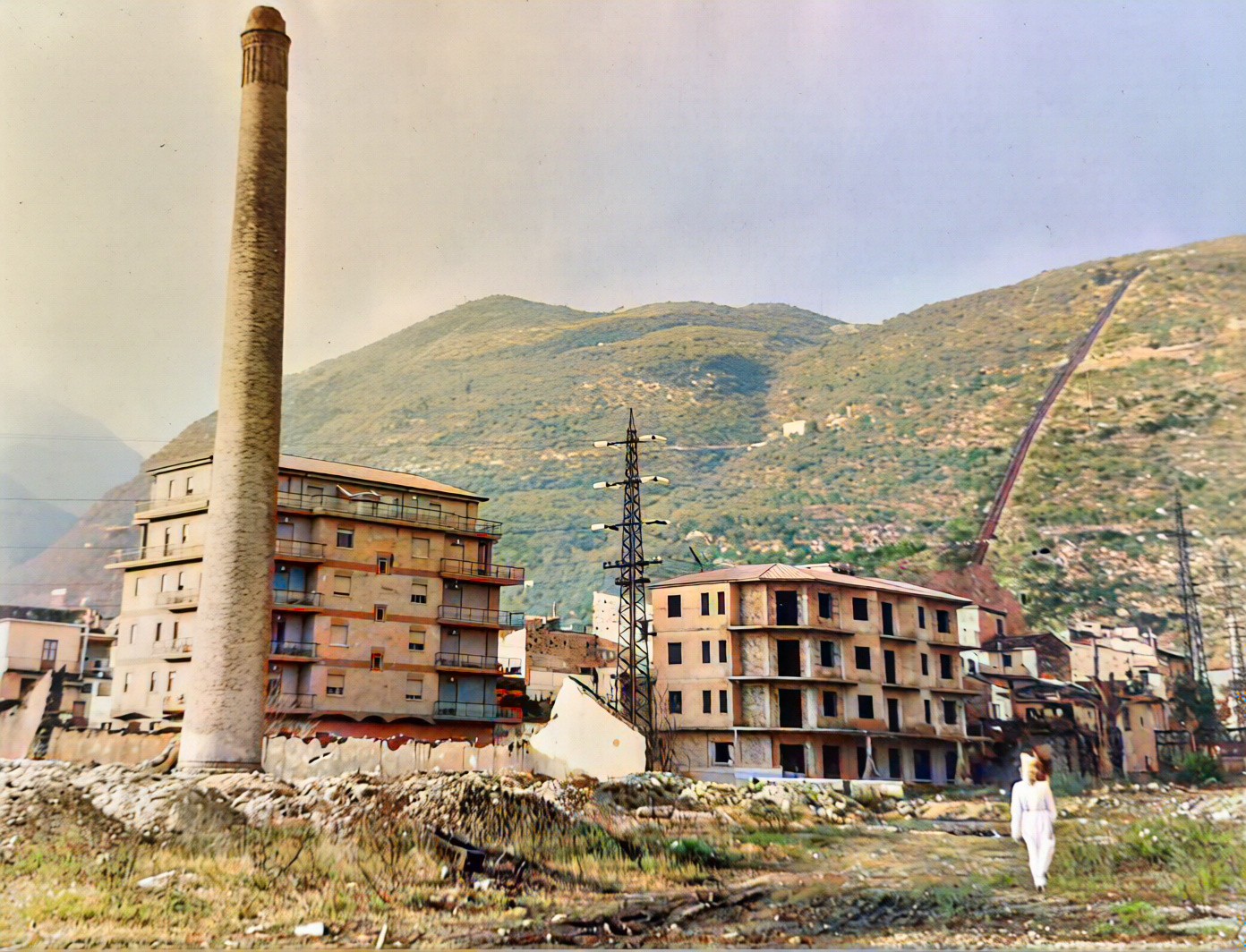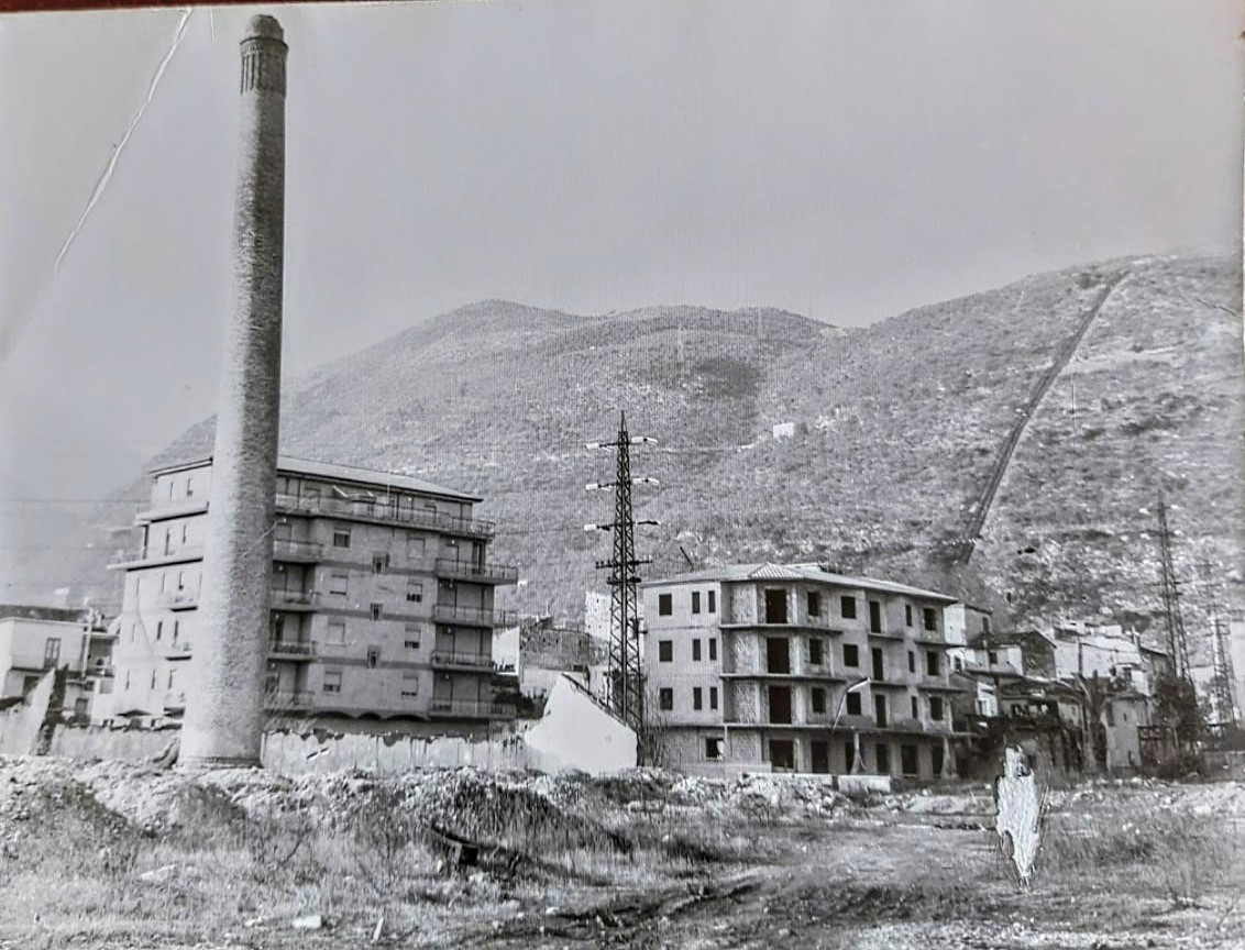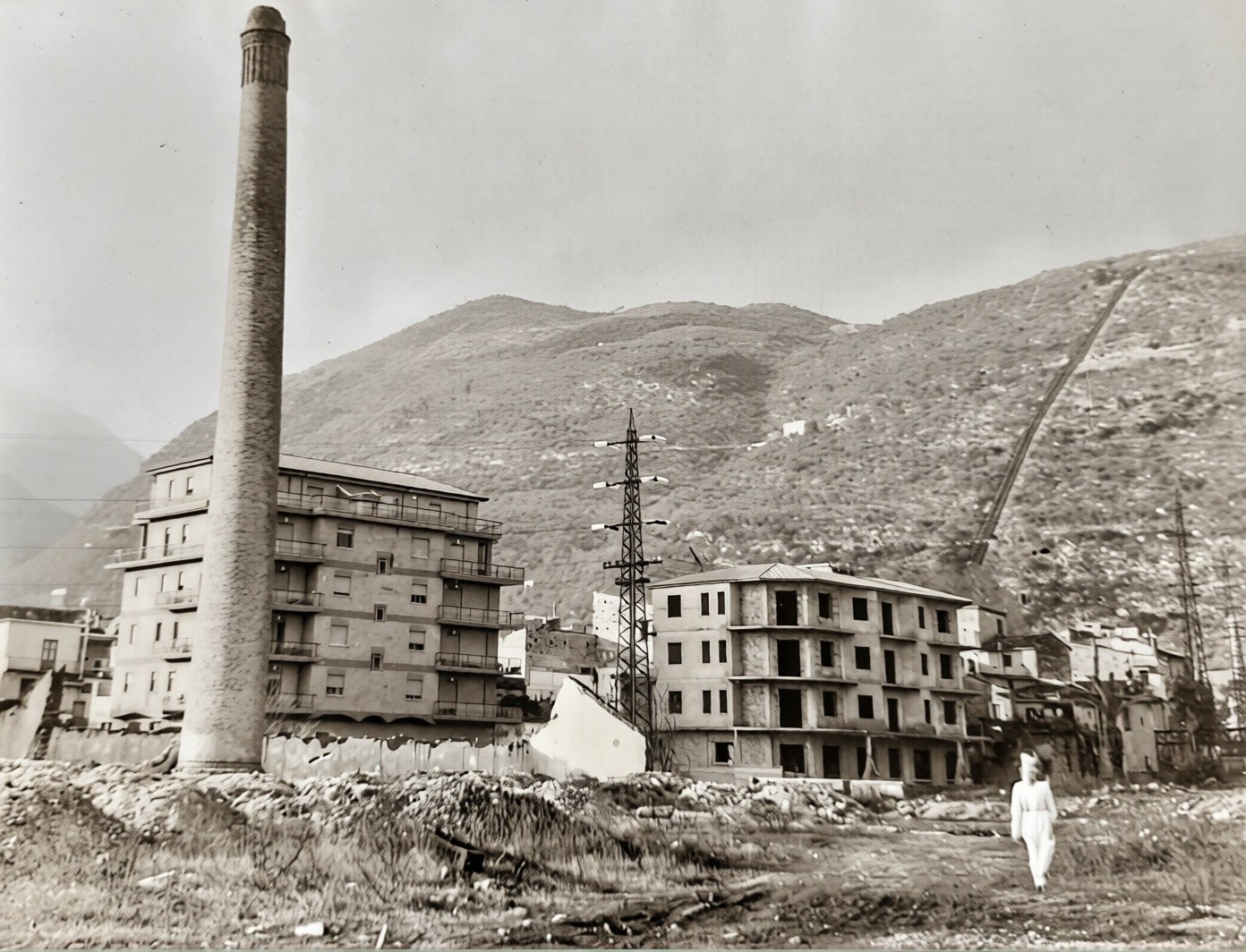 Foto di Piazza Carmine con Ciminiera e acluni resti dei parti del cotonificio, ripresa tra la scuola elementare e a pretura. I palazzi al di lá del Torano sono solo 2, quello adiacente al Ponte storico non é ancora stato costruito e sono presenti le costruzioni sotriche.